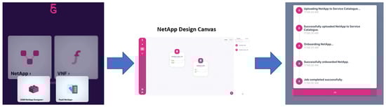 The NetApps Repository is a multi-component system forming a key part of the Experimentation Tools, facilitating the design and onboarding of NetApps via the CDSO. It is intended as an experimentation tool for 5GMediaHUB developers, offering flexible and user-friendly design and the deployment of NetApps, as shown in Figure 6. The NetApps Repository consists of several interconnected components, as follows: (i) a back-end service, which serves as the core of the system; (ii) a front-end web application for user interaction; (iii) a Service Catalogue for function discovery; and (iv) a GitLab instance for NetApp project storage.