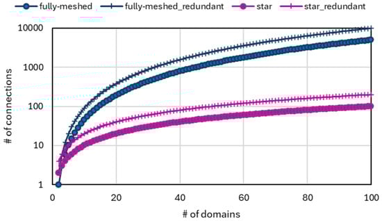 Moreover, the scalability of the architecture (from a potential fully meshed to a star setup) has been evaluated. As shown in Figure 7, the number of connections grows quadratically () for fully meshed architectures and only linearly (n) for a star architecture with the CDSO, where n is the number of domains. The complexity of federation is also substantially reduced as individual domains can have their own 5G SO systems, as well as being able to control how many VIM/CISM resources they will expose to the unified CDSO.