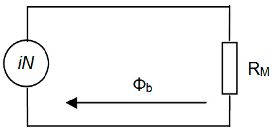 The equivalent magnetic circuit of the electronic fuel injector is illustrated in Figure 2. Here, i.N represents the magnetomotive force (with N denoting the number of coil turns), Φb stands for the magnetic flux, and RM indicates the total magnetic reluctance of the magnetic path. Based on Maxwell’s equations, the electromagnetic force acting across the working air gap L1 can be defined accordingly