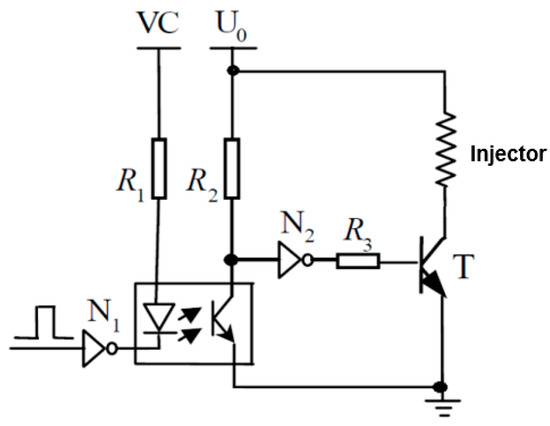 Figure 3 shows a schematic diagram of the electrical circuit that controls the operation of an electronic fuel injector. In its analysis, the saturation voltage of the power transistor in the closed state (i.e., when it is turned on) is neglected for simplicity. The electrical properties of the injector’s electromagnetic coil are represented by the equivalent resistance (R) and inductance (L). The voltage balance in this circuit can be described by the corresponding equation.