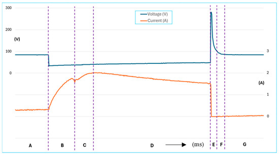 According to Figure 6, Interval A represents the period during which the injector remains inactive. Interval B captures the initial movement of the injector core—after voltage is applied to the coil, the current begins to rise sharply. Interval C marks the start of fuel injection, indicated by a continued increase in current. Interval D corresponds to the phase in which the injector is fully open and operating normally. Once the injection pulse ends, the current drops sharply as the energy stored in the coil is released. When the electromagnetic force can no longer counteract the return spring, the needle valve begins to close. Interval E shows the overvoltage spike caused by the inductive effect as the core returns to its original position. Interval F illustrates the gradual decay of this overvoltage, and Interval G signifies the injector returning to its idle state [17,18].