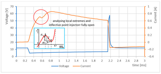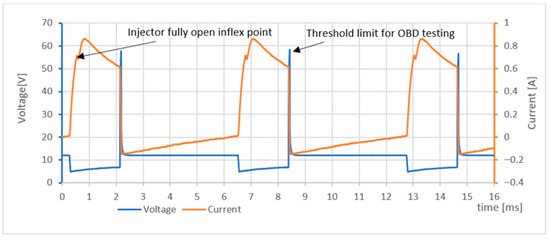 Changes in magnetic permeability are directly affected by the movement of the needle valve. The injector’s opening phase is reflected in the current waveform, while its closing is indicated by the voltage characteristics. Any partial or complete obstruction of the injector’s moving elements is considered a malfunction, as detected through the measured signal characteristics [15].