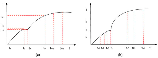 Theoretical analysis of the shape of the injector flow curve. (a) depicts idealized current flow during injector operation along with key sampling points that should be recorded when diagnosing the condition of the injection system; (b) shows the time profile of the current during the movement of the injector needle valve, measured using a logarithmic scale at seven time intervals.