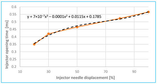 Figure 15 shows the simulated displacement characteristics of the moving injector needle as a function of the injector opening time (referred to as tx in Figure 8b).