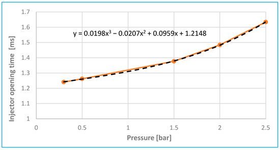 - Czarnigowski, J. Experiments on the Effect of Pressure and Voltage Supply on Pulse Injector Opening Time. SAE Tech. Pap. 2014, 1, 9. [Google Scholar] [CrossRef]