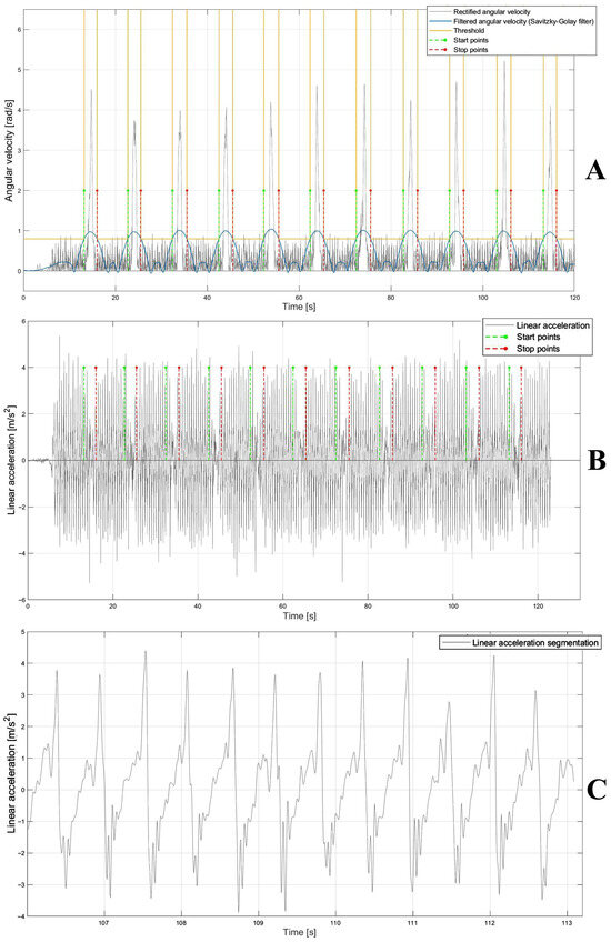 First, the detection of time intervals related to the turning phases was performed. To identify turns, the angular velocity signal was segmented to extract the time windows corresponding to the turning phases corresponding to an increase in the signal. The raw angular velocity data was first filtered through a 4th-order Butterworth band-pass filter (1–50 Hz) to remove the offset and preserve the spectral content of the inertial signal. The signal was then rectified and further filtered through a Savitzky–Golay filter [28] with a polynomial order equal to 2 and a frame length equal to 1101. Finally, an empirical threshold for each subject was established through an iterative approach to estimate the start and stop points in order to identify the time windows corresponding to the turning phases (Figure 4A). The time series of start and stop points were applied to the raw anteroposterior acceleration signal (Figure 4B) to identify the only time windows corresponding to 10 m walking phases, namely, the portions of the signal ranging from stop to start in which the gait events are detected (Figure 4C).