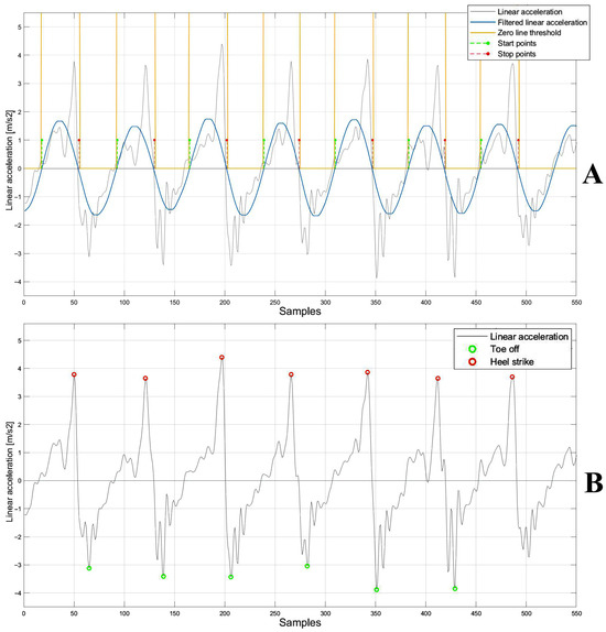 (A) Acceleration signal (gray), filtered signal using Savitzky–Golay filter (blue), zero-line threshold (yellow) and the start and stop points (green and red, respectively). (B) Linear acceleration signal (gray), heel-strike (red), and toe-off (green).