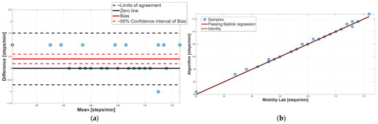Concerning the cadence parameter, as evidenced by the paired test (Table 2), a statistically significant difference was found; in particular, the proposed algorithm overestimated the value of this parameter compared to the Mobility Lab system. The BA plot showed that most data points lie above the zero-line, confirming this overestimation; moreover, the 95% confidence interval of the bias did not include the 0 value, indicating the presence of a systematic constant error (Figure 6a, Table 4). Finally, the random distribution of the data points around the bias line excludes the presence of a proportional systematic error, as shown in Figure 6a. PB analysis confirmed the absence of a proportional systematic error, since the slope m of the linear regression line is perfectly equal to 1; conversely, it does not recognize the presence of a constant systematic error; indeed, the intercept q value was equal to 0 (Table 3). This contrasting result is due to the very low constant systematic error (0.3%). Overall, for the cadence parameter, an agreement between the two methodologies was assessed.