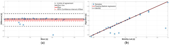 Gait cycle time. (a) Bland–Altman plot with bias, zero-line, and limits of agreement. (b) Scatter plot with Passing–Bablok linear regression line and line of identity.