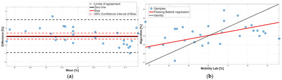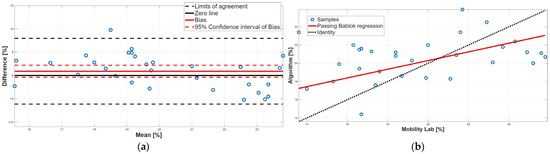 Finally, the double-support phase did not present a statistically significant bias, as shown in Table 2 and Table 4. However, there is a disagreement between the two methodologies because there is a proportional systematic error; indeed, as shown in Table 3, the 95% confidence interval of the PB linear regression slope m did not contain 1; this result was confirmed by the BA analysis, since in the BA plot the presence of a linear trend was found (Figure 10a). In conclusion, for the double-support phase, a disagreement between the two approaches was found due to the presence of a proportional systematic error. This result was to be expected since the double-support phase is correlated with the stance phase and the swing phase.