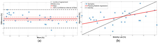 Stance phase. (a) Bland–Altman plot with bias, zero-line, and limits of agreement. (b) Scatter plot with Passing–Bablok linear regression line and line of identity.