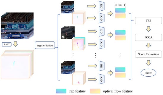 Figure 5. The method processes input videos by dividing them into multiple clips and extracting spatiotemporal features from both video streams and optical flow data. For the optical flow, the feature maps are extracted using RAFT [