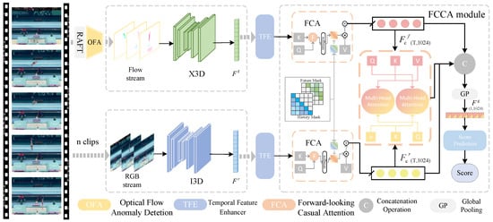 In parallel, video stream clips are processed by I3D to extract spatial pose and appearance features, while X3D is used on optical flow clips to capture dynamic temporal characteristics. To further enhance feature representation, the Temporal Feature Enhancer (TFE) module strengthens local action features. The forward-looking causal cross-modal attention (FCCA) module introduces spatiotemporal causal modeling by leveraging historical and future masks, thereby improving keyframe discrimination and cross-modal feature fusion, which integrates optical flow and video stream features. The scoring prediction module then produces quantitative assessments of action quality.