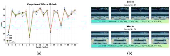 Figure 8b provides detailed prediction examples for two sample actions. For the high-score sample, the true label is 58.52, with CoRe and T