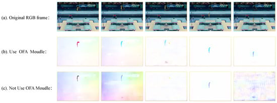 In contrast, the third row (c) displays the optical-flow maps without OFA processing. Here, the maps suffer from obvious noise interference, disordered motion vectors, blurred features, and poor extraction of dynamic information. This degradation can weaken the model’s ability to interpret action details, affecting the accuracy of motion analysis.