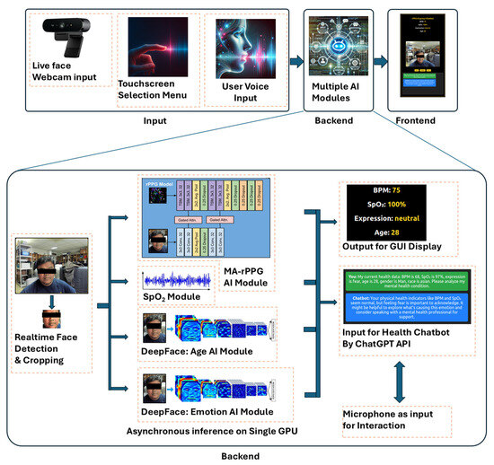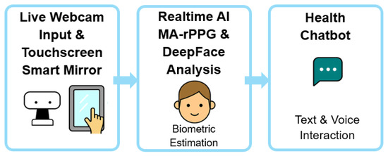 While various prototypes have explored individual elements—such as rPPG-enabled mirrors or AI-based emotion trackers, there remains a gap in the integration of multimodal sensing and interaction in a unified system [15] and continuous development by researchers to overcome it [17]. This paper addresses that gap by introducing AI multimodal smart mirror platform that combines three key modules: (1) real-time heart rate estimation using MA-rPPG [11]; (2) affective analysis via DeepFace [12]; and (3) a multilingual mental health chatbot powered by GPT-4o, widely used in healthcare chatbot research [18,19,20,21]. By embedding these technologies into a single cohesive platform, it becomes feasibility prototype to promote real-time health awareness and empathetic feedback.