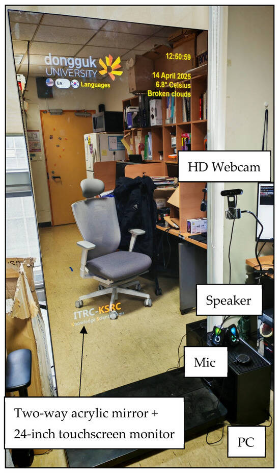 The smart mirror prototype is constructed using a two-way acrylic mirror mounted onto a 24-inch touchscreen monitor (Toshiba Corporation, Tokyo, Japan), serving both as a reflective surface and a graphical display unit. The display is connected to a high-performance edge computing system consisting of a desktop workstation running Ubuntu 20.04 LTS and equipped with an NVIDIA RTX 4060 Ti GPU (NVIDIA Corporation, Santa Clara, CA, USA). This hardware configuration is optimized for deep learning inference, enabling real-time processing of high-resolution video data and low-latency rendering, see Figure 3.