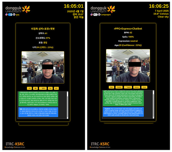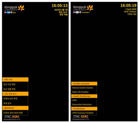 The interface supports both Korean and English, allowing users to switch languages instantly based on preference. Upon interaction, the GUI triggers backend processes that handle biometric sensing, emotional state analysis, and natural language conversation, returning results dynamically to the screen and, where applicable, through voice feedback. Each function operates in real time, enabling the system to adapt to the user’s current state and deliver personalized feedback without interruption.