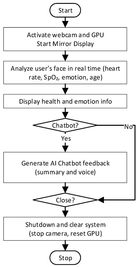 Finally, the Graphical User Interface (GUI) is rendered on a 24-inch touchscreen monitor overlaid with a two-way acrylic mirror. The GUI displays real-time vital signs, demographic information, emotional expression, and chatbot responses in both textual and audio form. The entire development workflow depicted in the Figure 2 demonstrates a complete loop—from sensor data acquisition to intelligent feedback delivery—offering a robust, low-latency, and human-centric interaction paradigm for ambient health monitoring.