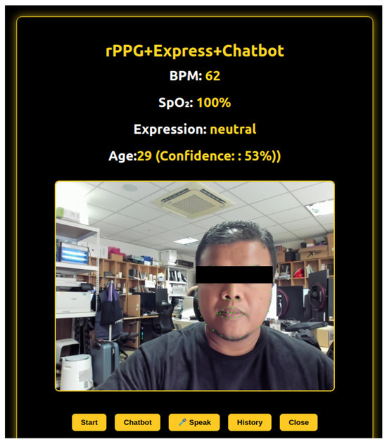 Fifth, a key limitation of this study is the absence of comparative benchmarking against alternative models or clinical-grade devices. This is due to limited computational resources, financial constraints, and the lack of access to clinical collaborators or participant cohorts for real-world testing. Therefore, we relied on models that have already been validated in prior research which are state-of-the-art AI models (MA-rPPG [11], DeepFace [12], and GPT-4o [18,19,20,21]). Future work will focus on establishing collaborations with clinical institutions to perform user studies and comparative evaluations.