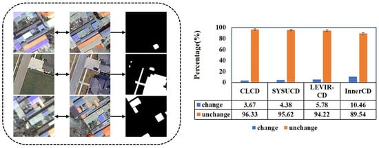 Partial samples of the Inner-CD dataset and the pixel imbalance distribution of other datasets. The left image presents a subset of the proposed Inner-CD dataset, while the right image illustrates the imbalanced distribution of changed and unchanged pixels across three datasets.