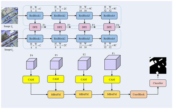 Remote sensing change detection involves analyzing images taken at various times from the same locations to recognize alterations on the Earth’s surface [1]. This technology has a wide range of applications in multiple fields, including monitoring urban expansion [2], analysis of land-use change [3], agricultural resource surveys [4], protection of the ecological environment [5], and assessment of natural disasters [6]. With continuous advancements in remote sensing technology, change detection techniques have gradually expanded to include a variety of data sources, including high-resolution optical, SAR, and hyperspectral data. The availability of different data sources has facilitated the development and innovation of corresponding change detection methods [7,8,9,10,11]. In recent years, advancements in optical sensor technology have significantly increased the number of acquisitions of dual-temporal remote sensing image data, promoting in-depth research into automatic change detection methods and achieving a significant improvement in model performance [12,13].