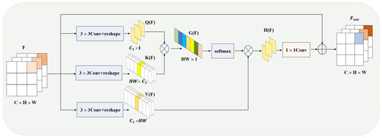 Figure 4 illustrates the detailed structure of the Global Transformer Module. The input feature first undergoes a 3 × 3 convolution and dimensional reconstruction to generate the query , key , and value , as shown in the following equation: