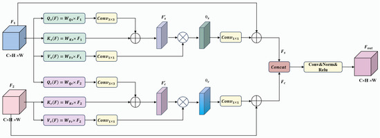 where the subscripts s and c represent the self-attention and cross-attention heads, respectively. and represent the initial self-attention features and cross features after pairwise computation of and using the query and key; and are used to generate the queries and keys in the self-attention mechanism; and are used to generate the queries and keys in the cross-attention mechanism. Next, the individual attention features of the two heads are computed as follows: