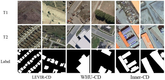 The efficacy of the proposed DynaNet was validated through experiments on two widely used public building change detection (BCD) datasets, LEVIR-CD [23] (LEarning, VIsion and Remote sensing laboratory, Beijing, China) and WHU-CD [53] (Wuhan University Sigma Laboratory, Wuhan, China), alongside our proprietary Inner-CD dataset. For consistency with our small-batch learning strategy, all datasets were uniformly segmented into non-overlapping image patches of 256 × 256 pixels and subsequently divided at random into training, validation, and testing subsets. Figure 6 presents visual examples of bi-temporal input images and their corresponding change labels from each dataset.