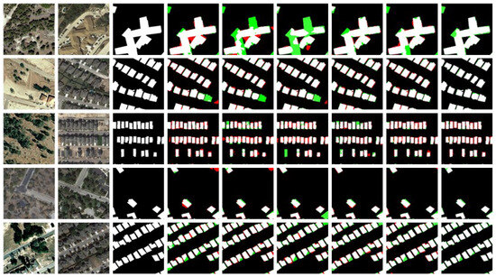 (2) LEVIR-CD [23]: The LEVIR-CD dataset contains 637 high-resolution (1024 × 1024) image pairs with a 0.5-m spatial resolution, collected across multiple cities in Texas, USA. The temporal gap ranges from 5 to 14 years. Building types include villas, apartments, garages, and warehouses, but change patterns are typically large-scale insertions of buildings into previously empty regions, making detection tasks more binary and localized.