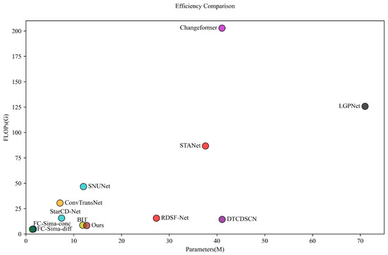 As indicated by the experiments, our proposed method surpasses the accuracy of the latest building change detection techniques on all three datasets. In this study, we employ the number of model parameters and floating-point operations per second (FLOPs) as metrics for model complexity and computational cost. The number of parameters reflects a model’s ability to learn and represent features, while FLOPs measure the computational effort required for a single forward pass, indicating the model’s efficiency and potential inference speed. Together, these metrics provide a balanced assessment of a model’s representational capability and computational efficiency—particularly crucial for constructing change detection tasks involving high-resolution images and timely processing. Table 6 presents these findings, with all methods standardized to an input size of 256 × 256 × 3 to ensure a consistent evaluation.