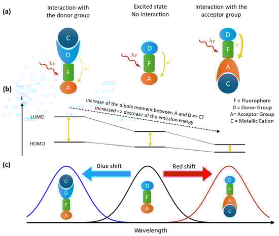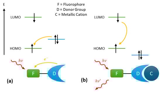 However, when the metal cation is complexed to the donor group, the energy level of the donor group’s HOMO becomes lower than that of the fluorophore’s HOMO (Figure 1b). As a result, the PeT in no longer possible, and the fluorescence from the probe is restored, enabled through the de-excitation of the fluorophore [].
