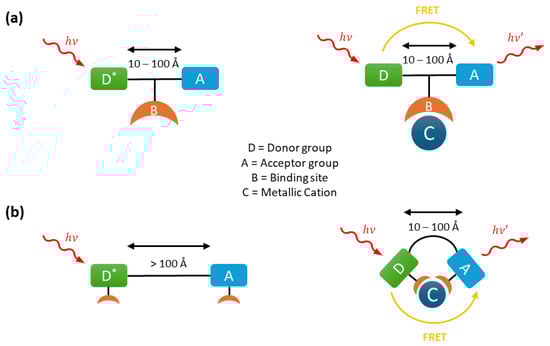 Fluorescence mechanism of Förster Resonance Energy Transfer (FRET) probes: (a) activation of FRET with cation binding and (b) with metal cation complexation bringing the two groups together.