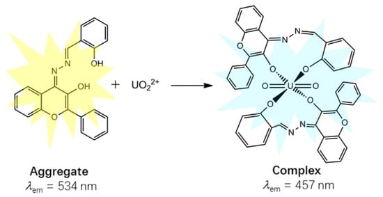The salicylaldehyde azine (SA) moiety can also function as an AIE fluorophore (Table 3). Chen et al. demonstrated that 4-pethoxycarboxyl SA [] and 3-hydroxy-flavone SA [] function as turn-on AIE sensors. These compounds aggregate upon interaction with [UO2]2+, leading to fluorescence emission (Figure 5). Interestingly, SA and 5-nitro SA were shown to exhibit a contrasting behavior: uranyl ions quench the AIE effect in an organoaqueous solvent by disrupting aggregation, as reported by Pham et al. [].
