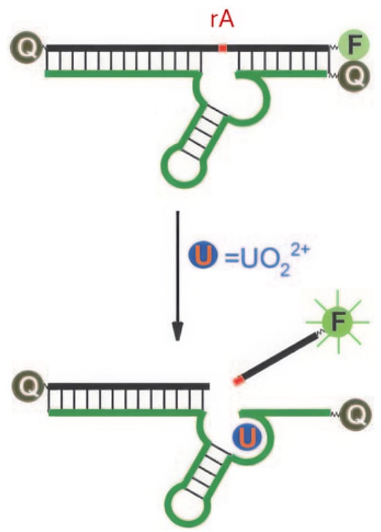 Principle of fluorescence detection of [UO2]2+ using a DNAzyme []. F represents the fluorophore, Q the quencher, and rA the ribonucleotide adenosine.