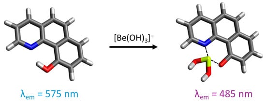- Matsumiya, H.; Hoshino, H.; Yotsuyanagi, T. A novel fluorescence reagent, 10-hydroxybenzo[h]quinoline-7-sulfonate, for selective determination of beryllium(II) ion at pg cm23 levels. Analyst 2001, 126, 2082–2086. [Google Scholar] [CrossRef] [PubMed]