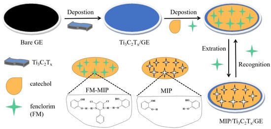 The general fabrication procedure for the fenclorim (FM) molecularly imprinted electrode (MIP/Ti3C2Tx/GCE) is presented in Figure 1. Briefly, the Ti3C2Tx/GCE was initially immersed in 10 mL acetate buffer (0.1 M, pH 5.0) containing the template FM (1 mM) and the catechol functional monomers (12 mM) for 30 s, and then, polymerization was performed by CV between −0.2 and 0.8 V for 10 cycles at a 75 mV/s scan rate. After electropolymerization, the resultant electrode was immersed in 15 mL methanol–acetonitrile (1:2, v/v) solution and stirred for 30 min to remove the embedded template molecules, and subsequently rinsed with water and dried. For comparison, the non-imprinted polymer (NIP) was prepared using the same method but without adding the target template molecules, and the obtained electrode was denoted as NIP/Ti3C2Tx/GCE.