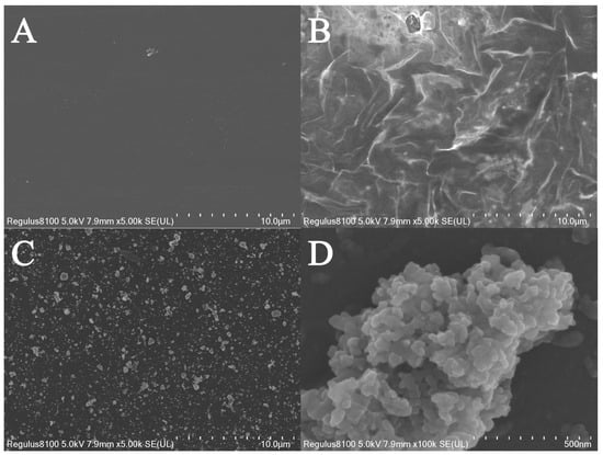 The morphology of each surface of the different electrodes was investigated using a scanning electron microscope. As shown in Figure 2A, the bare electrode exhibited a smooth surface. In contrast, after modification with Ti3C2Tx, the Ti3C2Tx-modified electrode displayed a wrinkled morphology (Figure 2B), which is consistent with previous reports []. This wrinkled structure is advantageous as it provides a larger specific surface area and facilitates electron transfer [,]. Following the modification with molecularly imprinted polymers, the electrode surface was covered with numerous irregular polymeric aggregates (Figure 2C), which exhibited a distinct morphology compared to that of the Ti3C2Tx-modified electrode. In particular, the locally enlarged image (Figure 2D) highlighted that the surface of these irregular polymeric aggregates had a three-dimensional structure and roughness. This characteristic is significant as it creates more binding sites for template molecules, thereby enhancing the efficiency of molecular recognition.