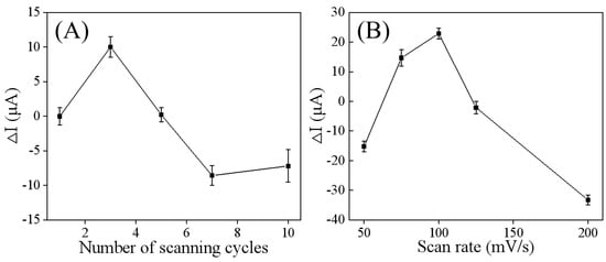 Optimization of factors affecting the electrodeposition performance of the Ti3C2Tx/GCE: the number of scanning cycles (A) and scan rate (B). ΔI represents DPV peak current change (ΔI = I − I0) before and after electrodeposition of Ti3C2Tx.