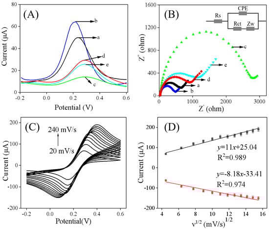 (A) DPV and (B) curves of different electrodes for EIS conducted in a 0.1 M KCl supporting electrolyte containing 5.0 mM of [Fe(CN)6]3−/4−, bare GCE (a), and Ti3C2Tx/GCE (b), MIP/Ti3C2Tx/GCE before (c) and after (d) removing of FM, and MIP/TTi3C2Tx/GCE after incubation in 50 nM FM (e). (Inset is the Randles circuit model for the modified electrodes. Rs, electrolyte solution resistance; Rct, interfacial electron transfer resistance element; Zw, Warburg impedance resulting from ion diffusion; CPE, constant phase angle element.) (C) CV curves of MIP/Ti3C2Tx/GCE at scan rates ranging from 20 to 240 mV/s, and (D) linear relationship between ν1/2 and the peak current.