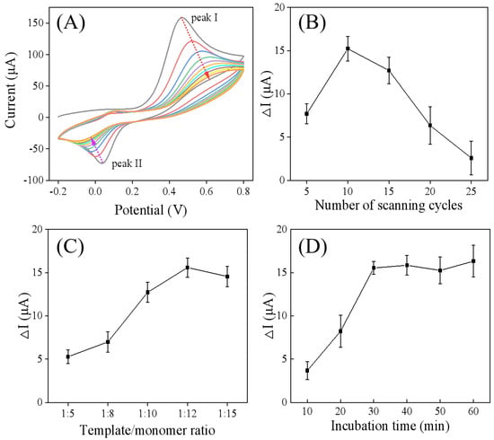 Given that the incorporation of the template into the polymer film is significantly influenced by incubation time, this parameter was optimized. As shown in Figure 5D, with increasing incubation time, the ΔI value of the DPV peak current initially increased and stabilized approximately after 30 min, signifying that the adsorption capacity had reached saturation. Consequently, 30 min was designated as the optimal incubation time for subsequent experiments.