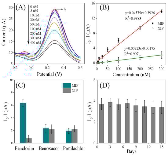 To further investigate the selectivity of the molecularly imprinted sensor, it was evaluated in solutions containing FM (100 nM) along with interfering substances at 10-fold higher concentrations, such as pretilachlor or benoxacor. Pretilachlor is a chloroacetamide herbicide that provides pre-emergence control of annual grassy weeds and some broadleaf weeds in rice []. Benoxacor and FM are commonly used as safeners and are often combined with dichloroacetamide herbicides (with the safener additive accounting for less than 10%) because they can alleviate the phytotoxicity of herbicides on crops [,]. As shown in Figure 6C, the NIP electrode exhibited almost identical responses to FM and other interfering substances. This is because there are no imprinting cavities in NIP that match FM, resulting in a lack of selectivity. In contrast, the MIP electrode showed a high current response only to FM, while its responses to several interfering substances were low; furthermore, there was almost no significant difference in current responses to different interferents. These results indicate that the prepared MIP electrode not only has a better current response but also maintains high selectivity and specific recognition ability for FM. This can be attributed to the fact that FM can occupy the imprinted cavities through hydrogen bonding, leading to an obvious change in current. The stability of the molecularly imprinted sensor was also evaluated over 15 days under laboratory conditions. As shown in Figure 6D, the DPV peak current responses decreased by less than 10%, demonstrating that the fabricated sensors have appropriate stability.