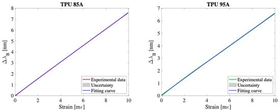 By applying Equation (3), an average sensitivity equal to 0.76 nm/mε was obtained for the TPU 85A sensor and 0.66 nm/mε for the TPU 95A sensor, highlighting a greater mechanical response of the softer material. Furthermore, the low value of the experimental uncertainty in the ten tests confirms the high repeatability of the sensors’ response to mechanical deformation (grey area in Figure 3).