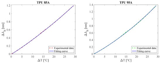 The ΔλB vs. T experimental data (red dotted line for TPU 85A and green dotted line for TPU 95A) and the fitting curve (blue line).