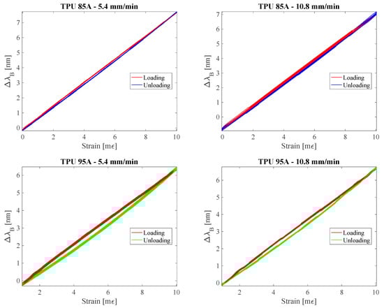 The analysis showed that the sensor encapsulated in TPU 85A has an average thermal sensitivity of 0.041 nm/°C, while the one in TPU 95A shows a slightly higher value of 0.047 nm/°C. This difference can be attributed to the different mechanical and thermal expansion properties of the polymer materials used. In particular, the higher stiffness of TPU 95A generates a more marked thermal stress on the optical sensor, contributing to the increase in the response in terms of ΔλB. This increase in thermal sensitivity can primarily be attributed to the higher stiffness of TPU 95A, which leads to a more effective transfer of thermally induced stress to the fiber. While both TPU grades have similar coefficients of thermal expansion (CTE ≈ 160–200 × 10−6 /°C), the stiffer TPU 95A constrains the fiber more during thermal expansion, resulting in greater axial strain [].