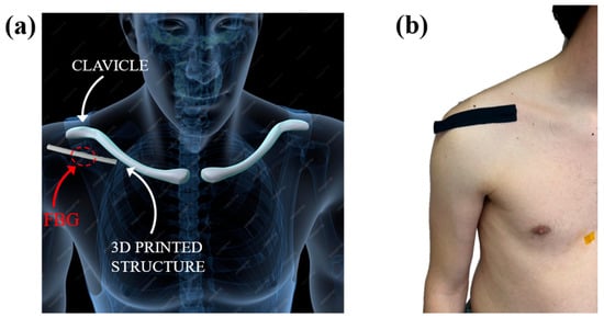Positioning of the device in the antero-lateral region of the shoulder: (a) Schematic representation of the sensor placement; (b) Wearable device attached to the subject.