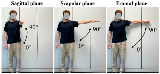 During the experiment, participants were asked to perform a F/E movement of the upper limb in three different anatomical planes: sagittal, scapular and frontal. Each sequence consisted of an extension from 0° to 90°, followed by a return to the starting position, with a pause of approximately 3 s between each execution (Figure 8). The movements were performed at free speed, in order to simulate a natural physiotherapy execution, without imposed constraints, as can be seen in the Supplementary Material Video S1.