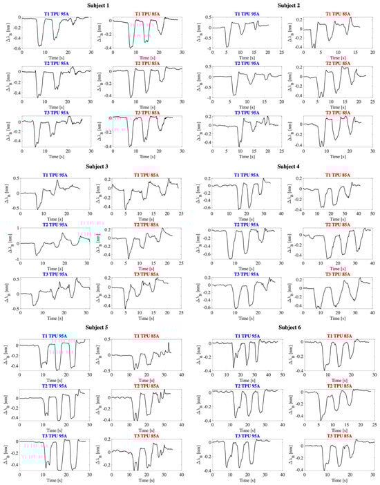 Overall results of ΔλB variations by subject and motion plane, distinguished by sensor material (TPU 95A and TPU 85A) and trial number (T1, T2 and T3).