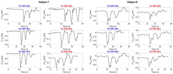 Wearable sensor output for both materials (TPU 85A and 95A), considering the three trials (T1, T2 and T3) conducted on each of the 8 subjects.