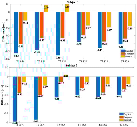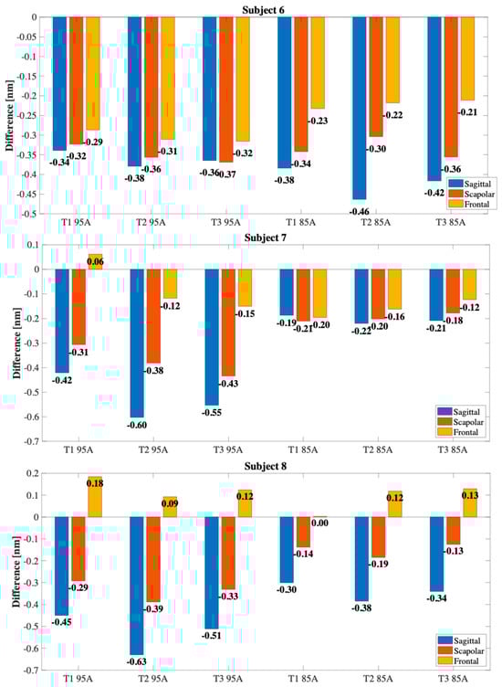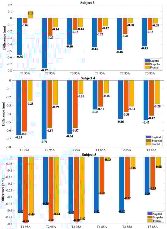 Only under four conditions was it not possible to clearly discriminate all three planes of movement: for subject 7 when using TPU 85A sensor (−0.19 nm in the sagittal plane vs. −0.21 nm in the scapular plane in T1), for subject 5 when using TPU 95A sensor (−0.42 nm sagittal vs. −0.49 nm scapular in T1 and −0.36 nm sagittal vs. −0.48 nm scapular in T2), and for subject 6 when using TPU 95A sensor in T3 (−0.36 nm sagittal vs. −0.37 nm scapular). In these cases, the signal was less defined and the separation between the ΔλB signal associated with the different planes was not sufficiently marked. It is likely that this limitation is attributable to specific anthropometric characteristics such as, for example, the shape of the shoulder and, above all, to the variability introduced by the positioning of the sensor, which represents a critical factor for the reliability of the measurement.